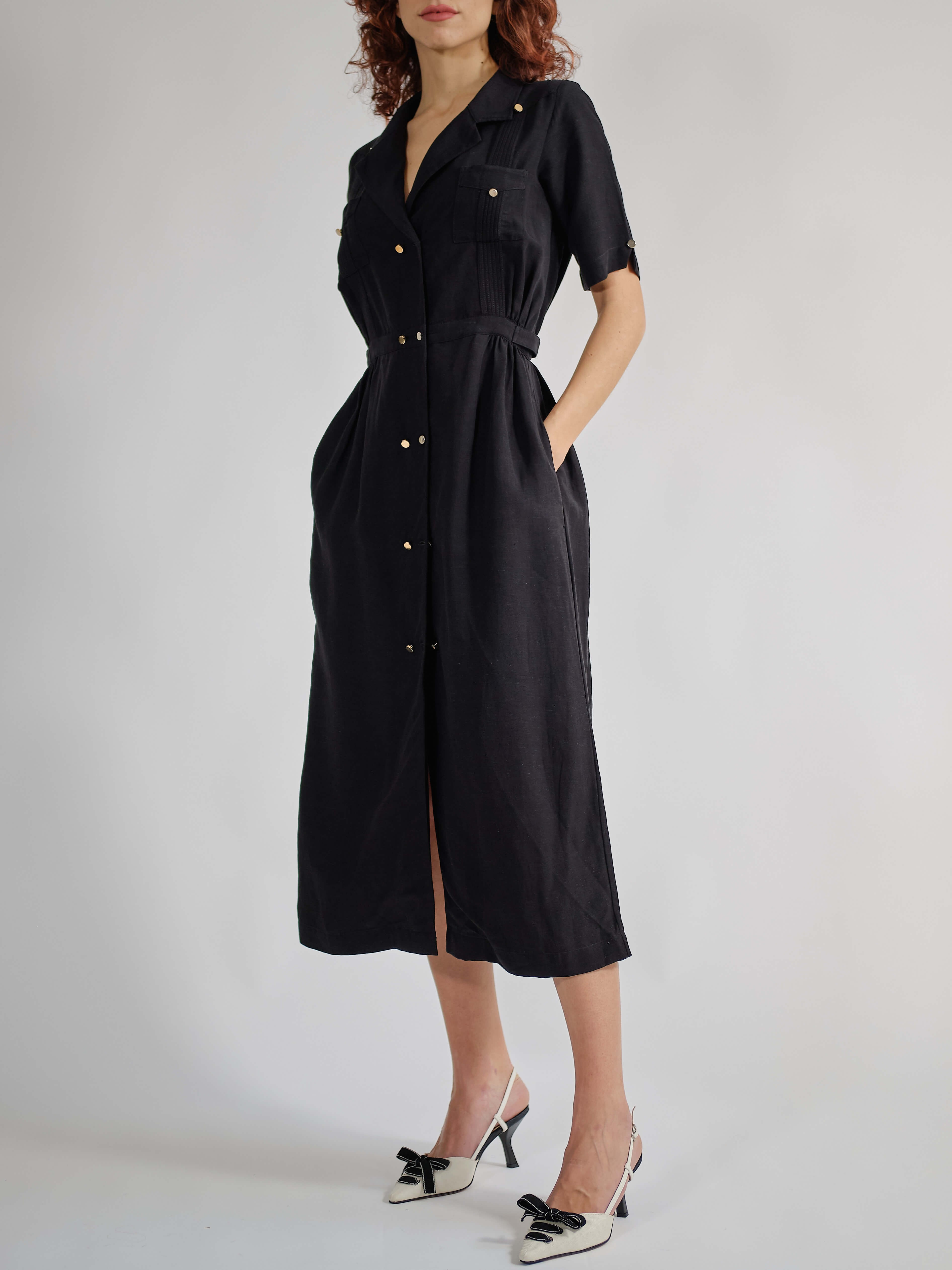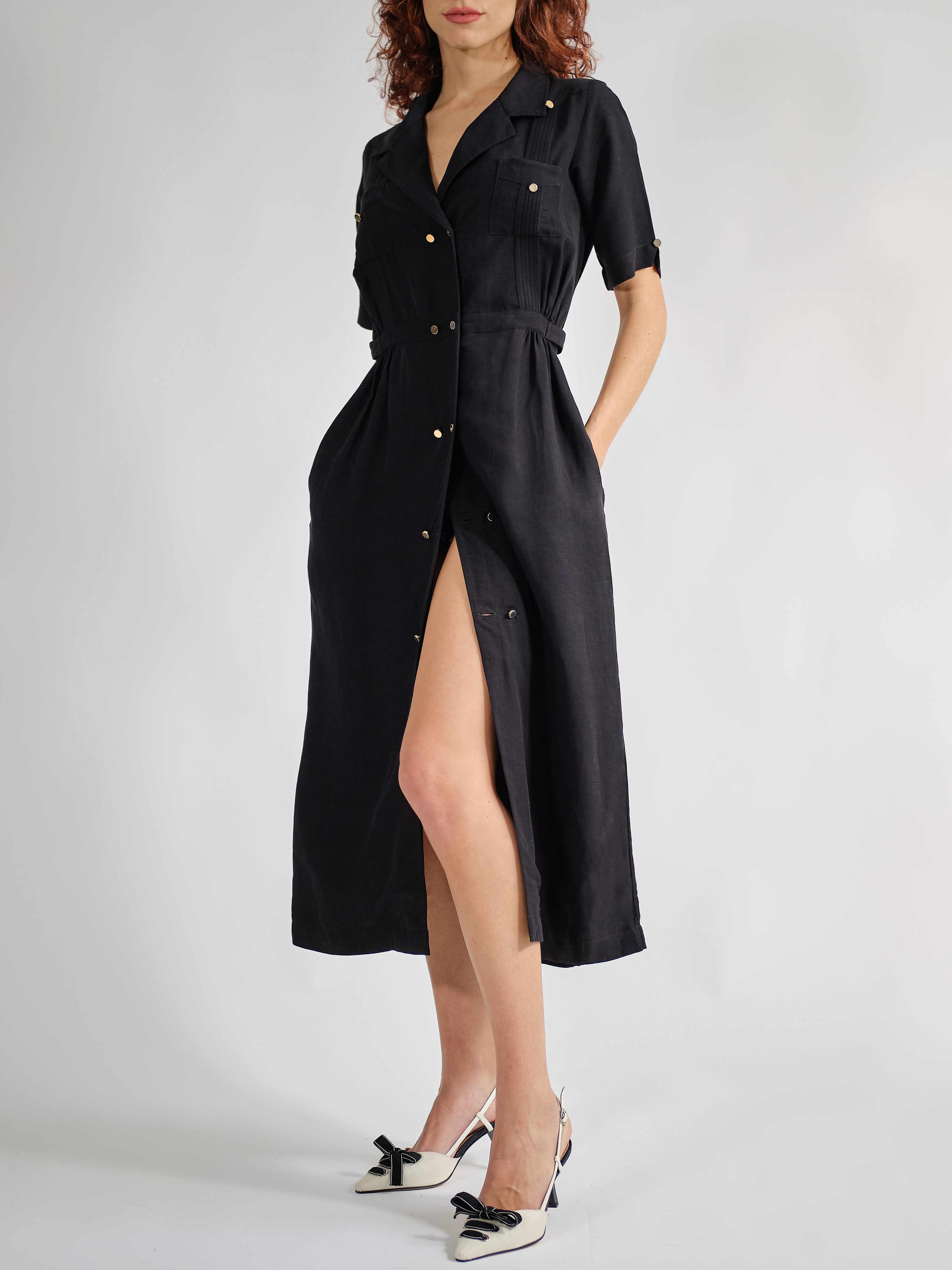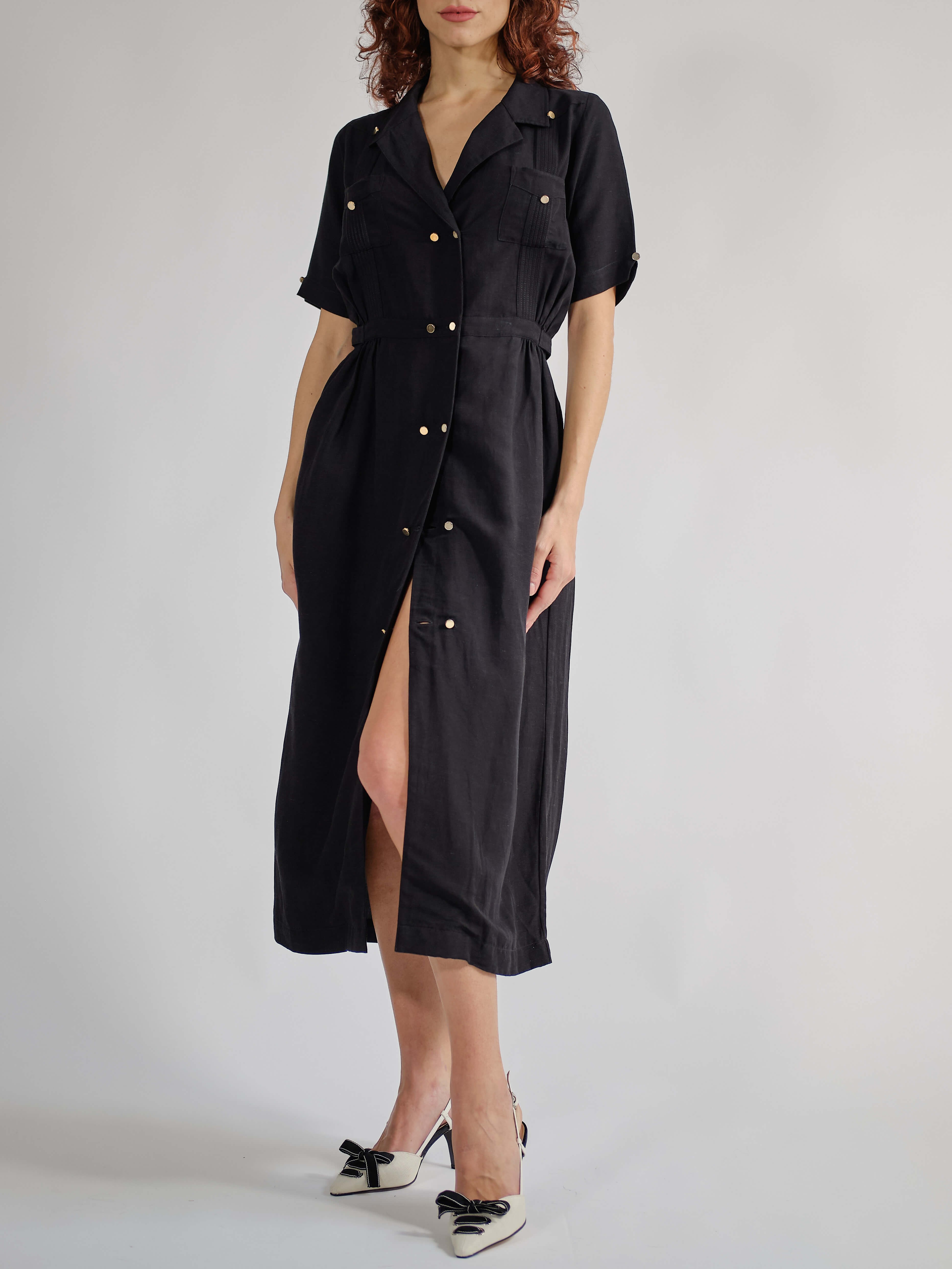 VESTIDO CA: El vestido Guayabera CA, un nuevo estilo de guayabera para mujer que equilibra glamour y funcionalidad, fusionando el estilo cubano con la innovación textil. El tejido es una mezcla de dos fibras naturales: viscosa y lino, una combinación perfecta de la textura del lino y la fluidez de la viscosa. El vestido, suavemente envolvente, se cierra con una doble hilera de botones metálicos dorados; su corte largo facilita su uso. Colores: blanco y negro. Corte regular.