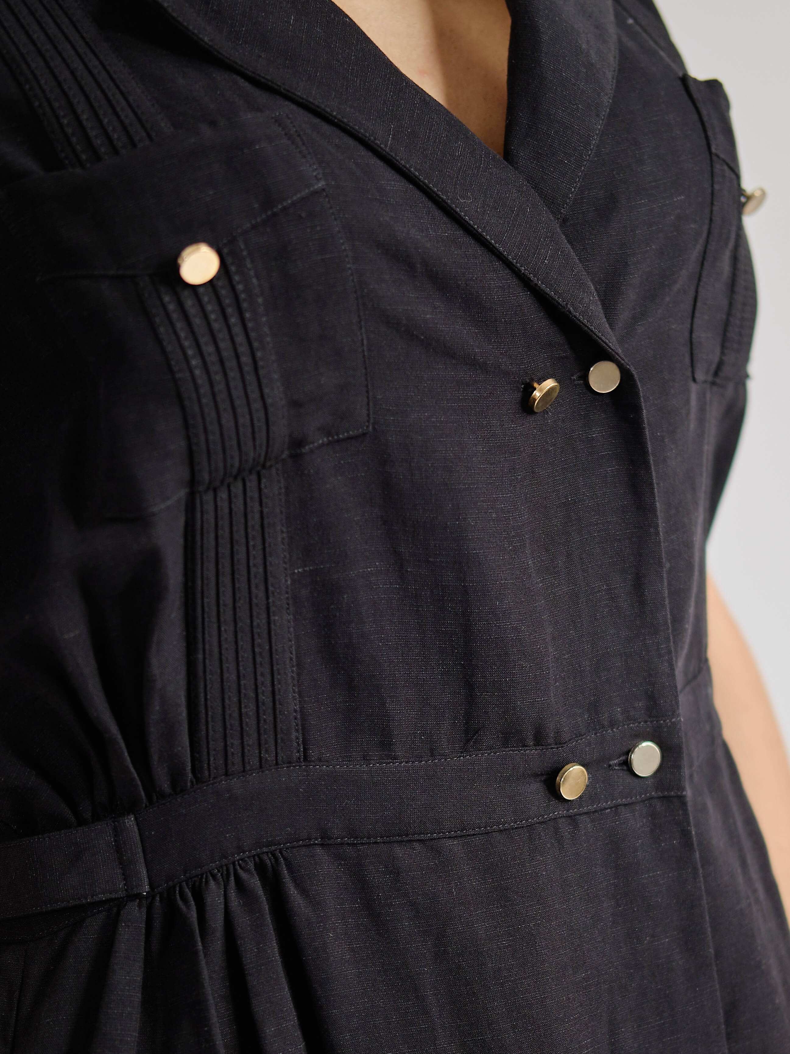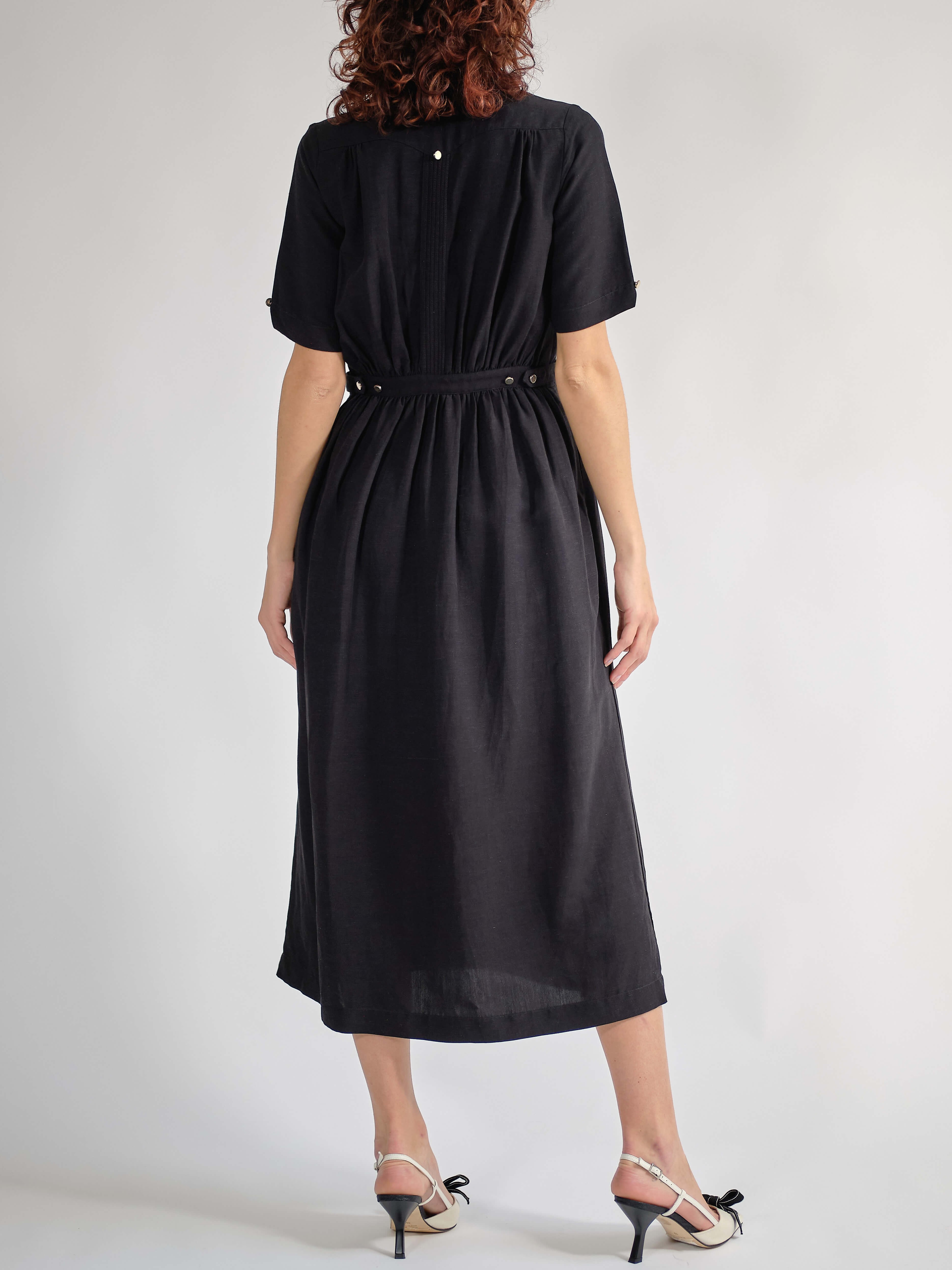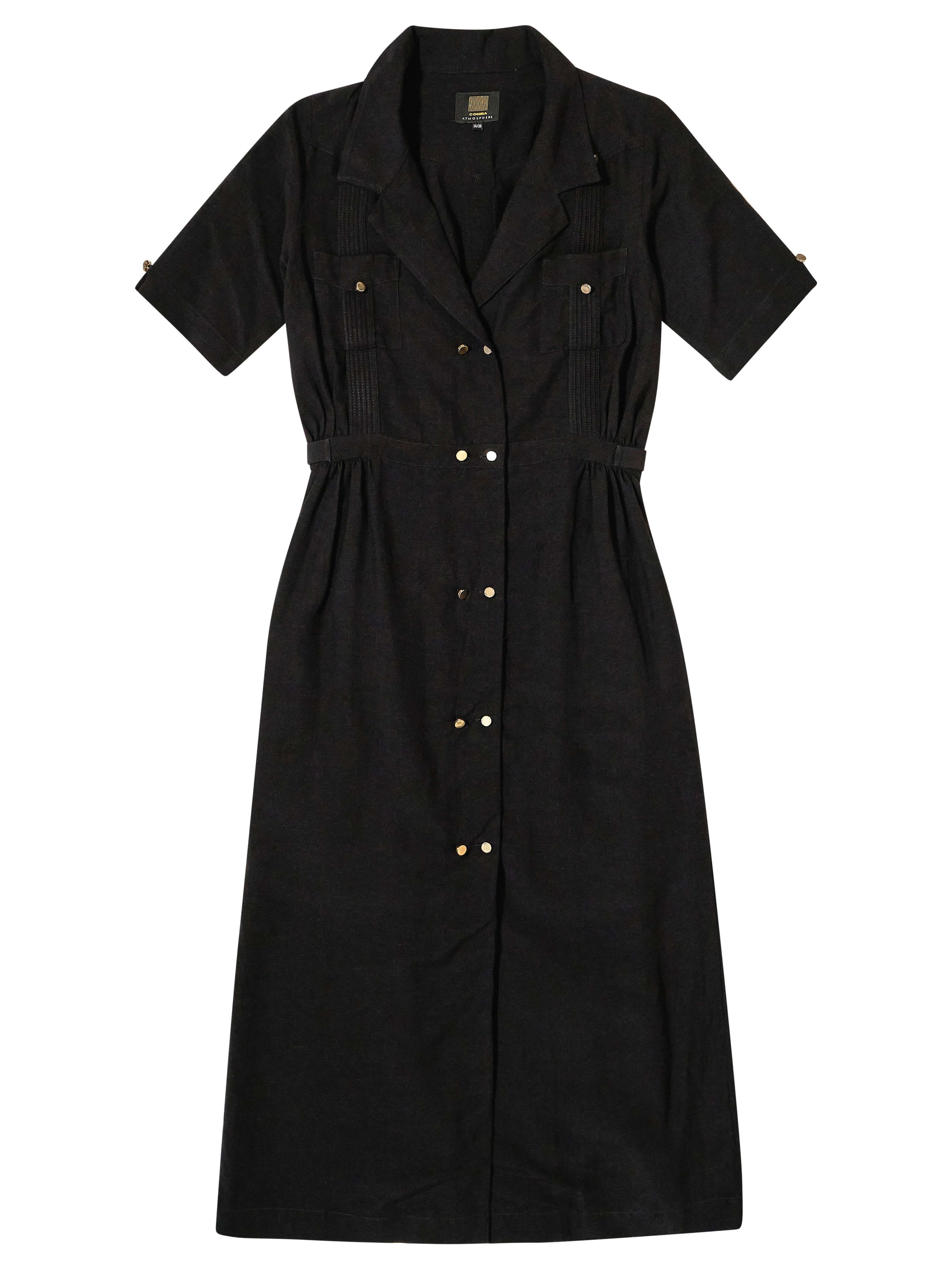 VESTIDO CA: El vestido Guayabera CA, un nuevo estilo de guayabera para mujer que equilibra glamour y funcionalidad, fusionando el estilo cubano con la innovación textil. El tejido es una mezcla de dos fibras naturales: viscosa y lino, una combinación perfecta de la textura del lino y la fluidez de la viscosa. El vestido, suavemente envolvente, se cierra con una doble hilera de botones metálicos dorados; su corte largo facilita su uso. Colores: blanco y negro. Corte regular.