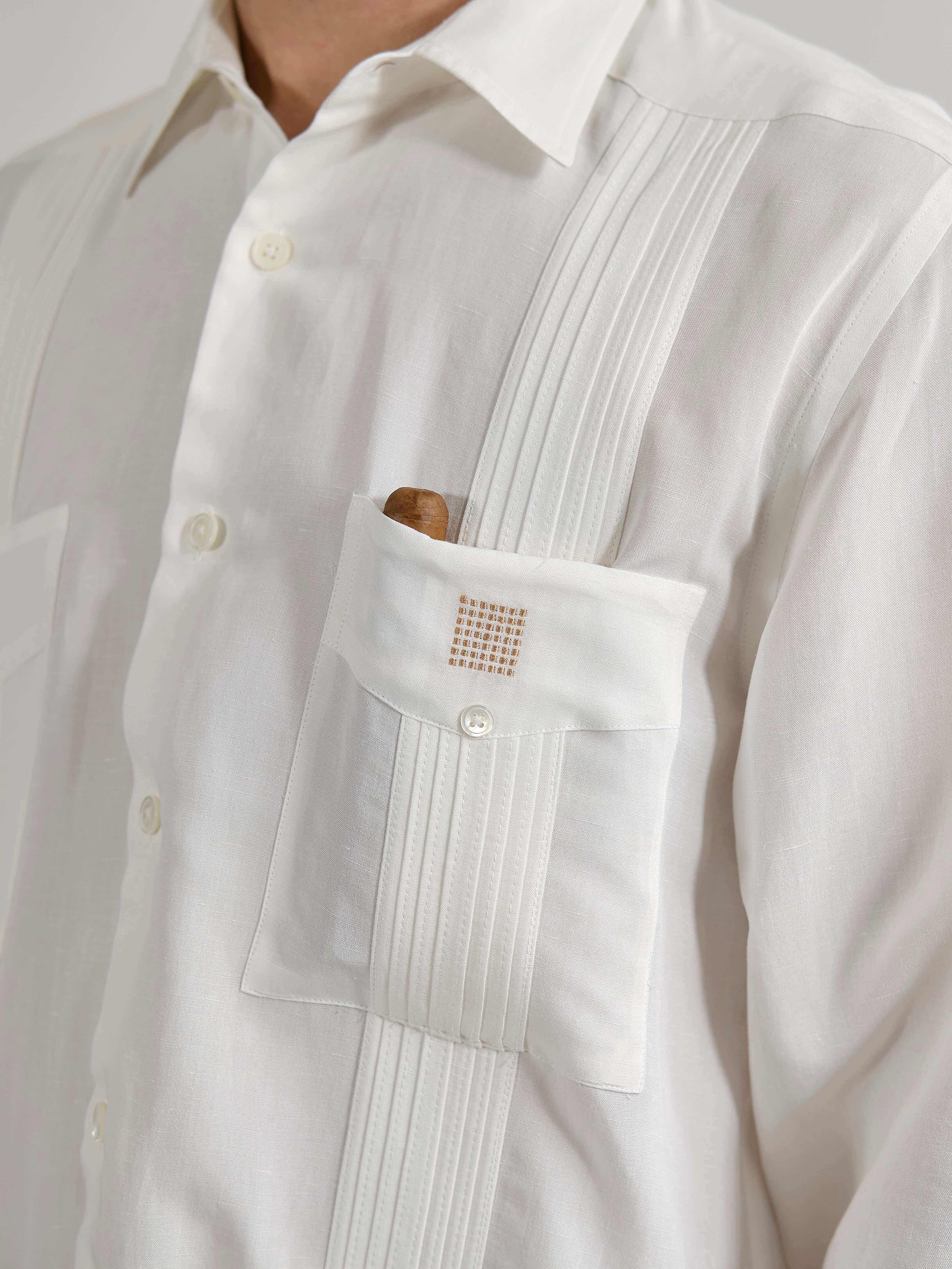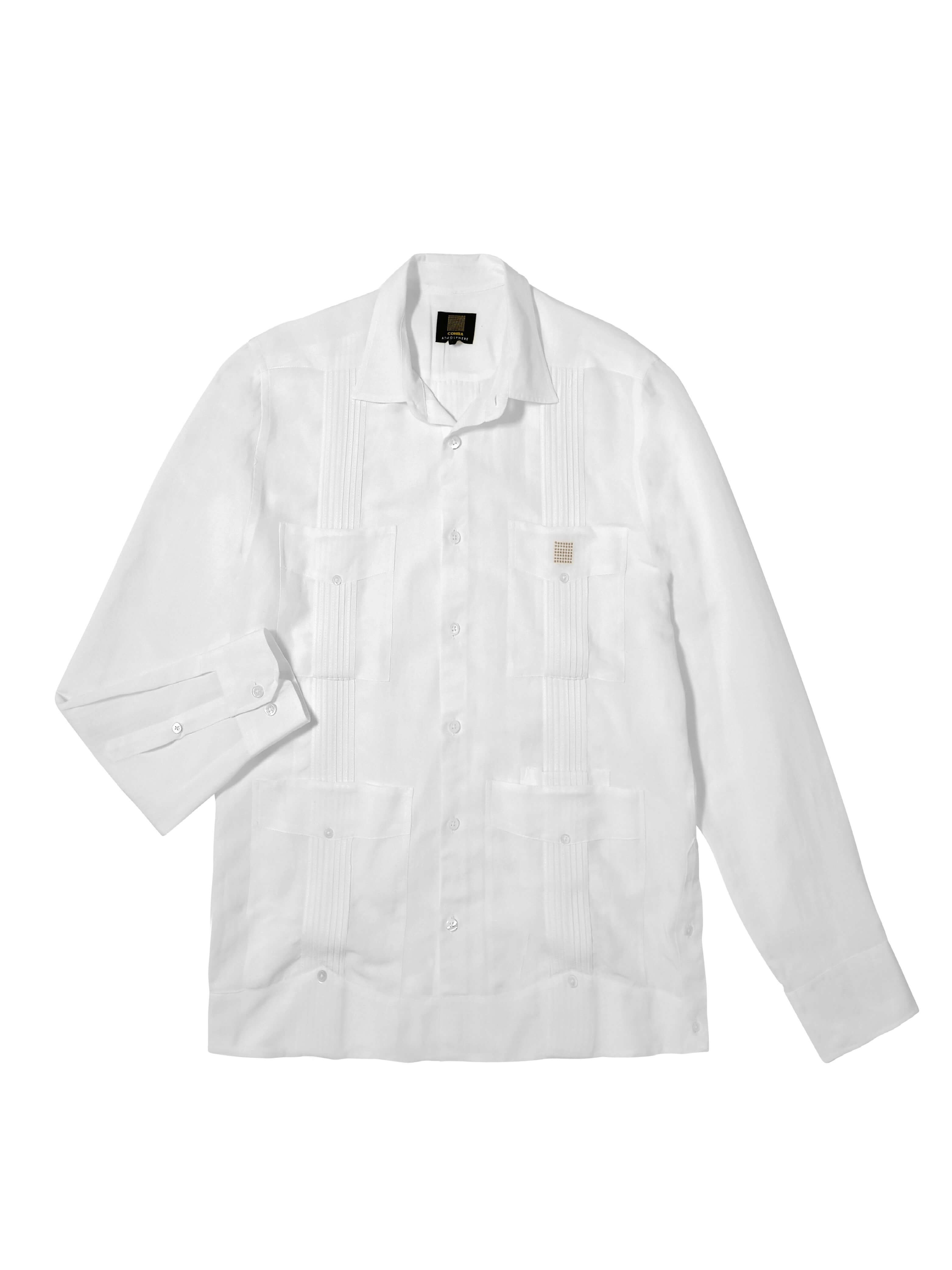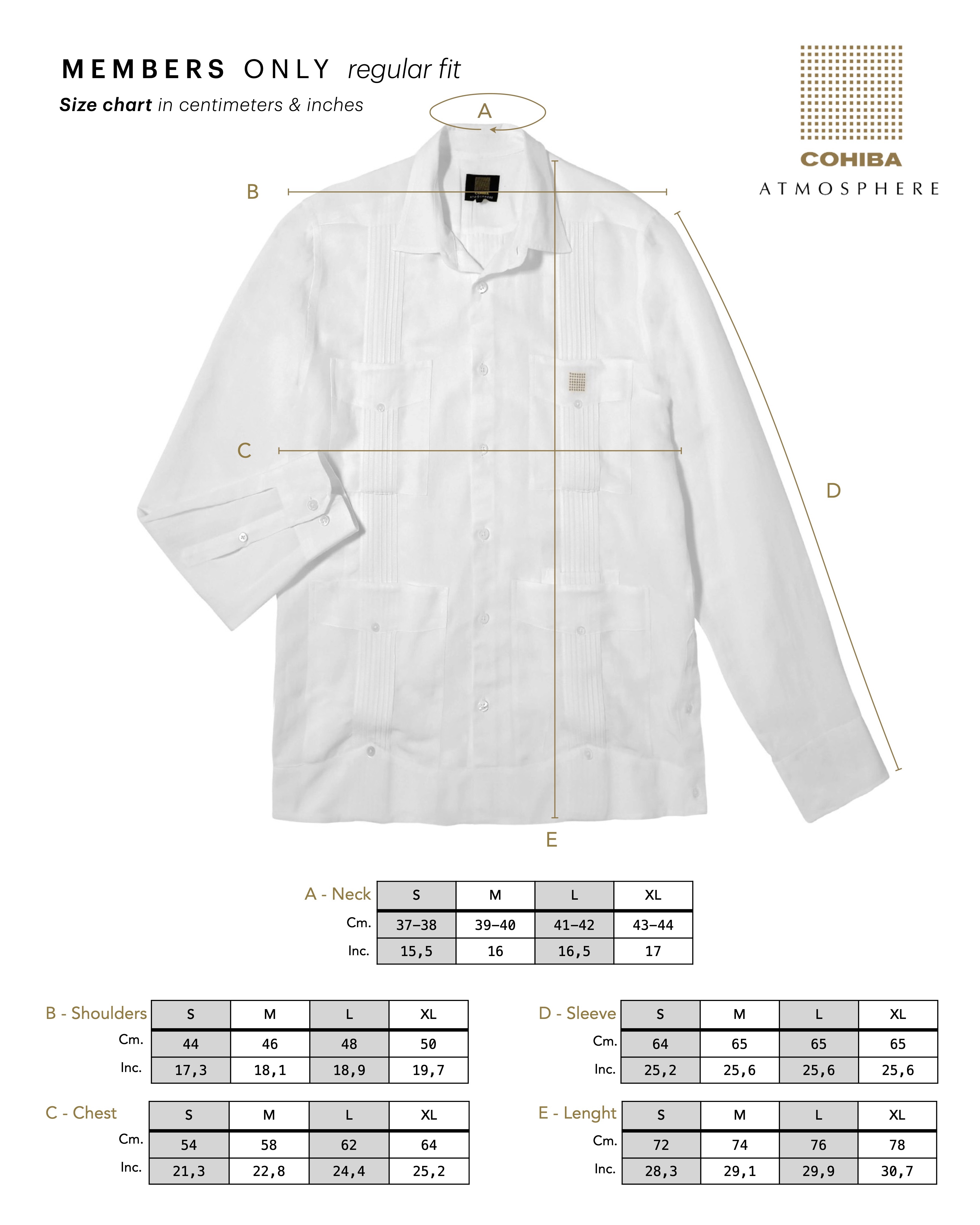 La Guayabera Members Only, il tessuto è un blend di due fibre naturali: Viscosa e Lino, una combinazione perfetta tra la texture del Lino e la fluidità della Viscosa. Si distingue per le sue tasche superiori quadrate, un dettaglio utile per mantenere al sicuro i tuoi Habanos, e una quinta tasca per l'accendino e il taglia-sigari, con bottoni in vera madreperla e il motivo ricamato in colore oro del logo Cohiba Atmosphere. Colori: bianco e nero. Vestibilità regolare