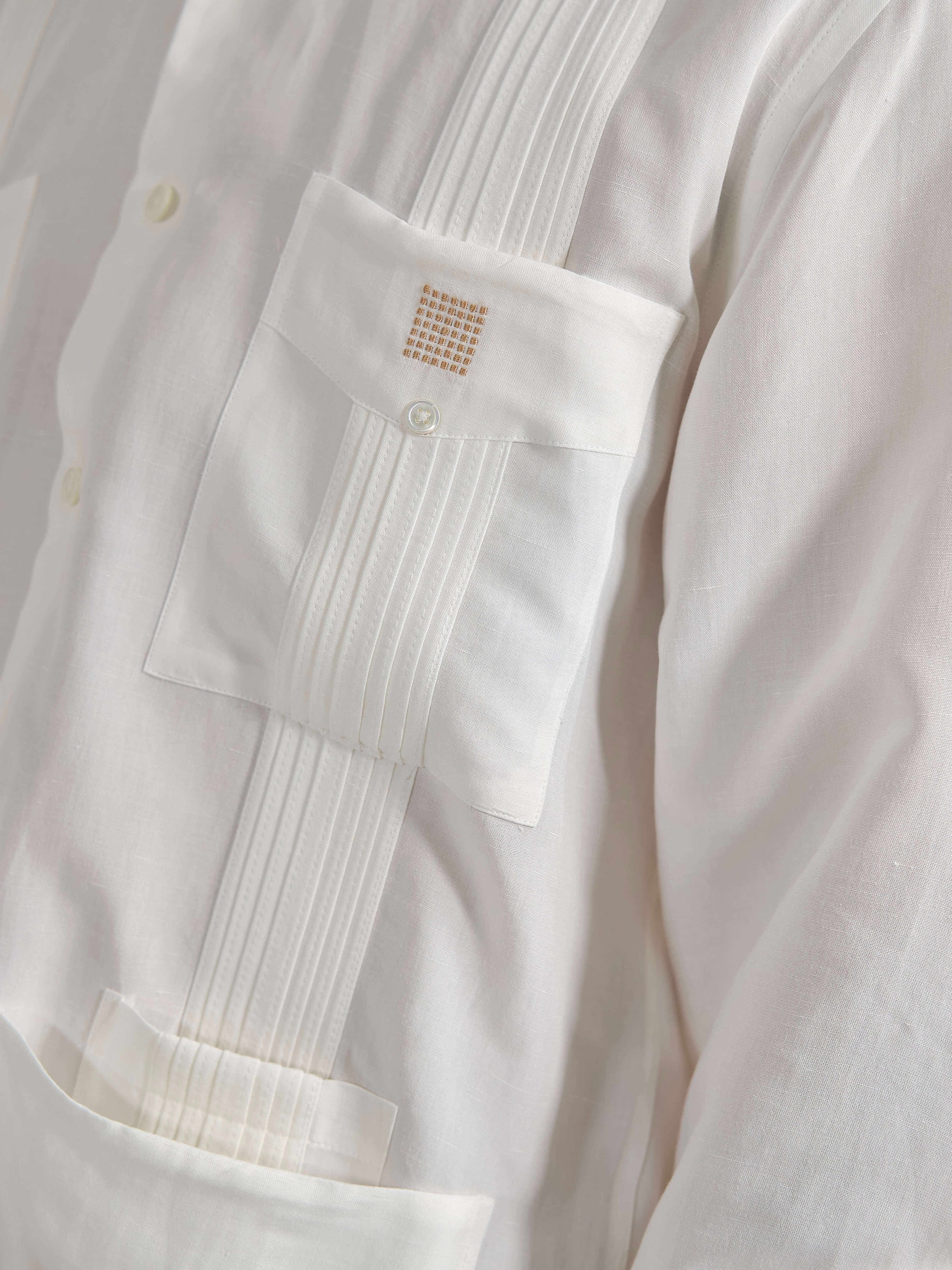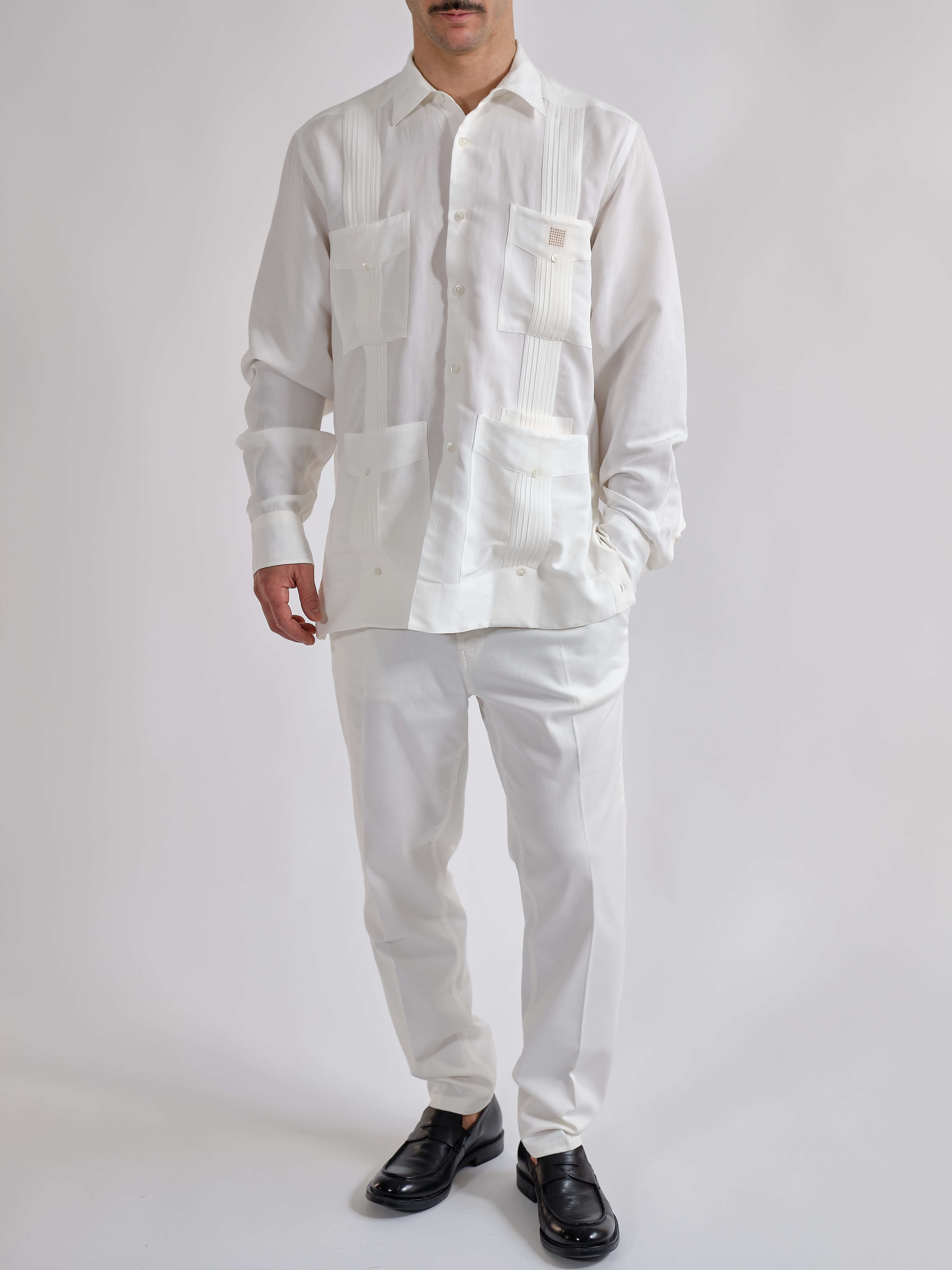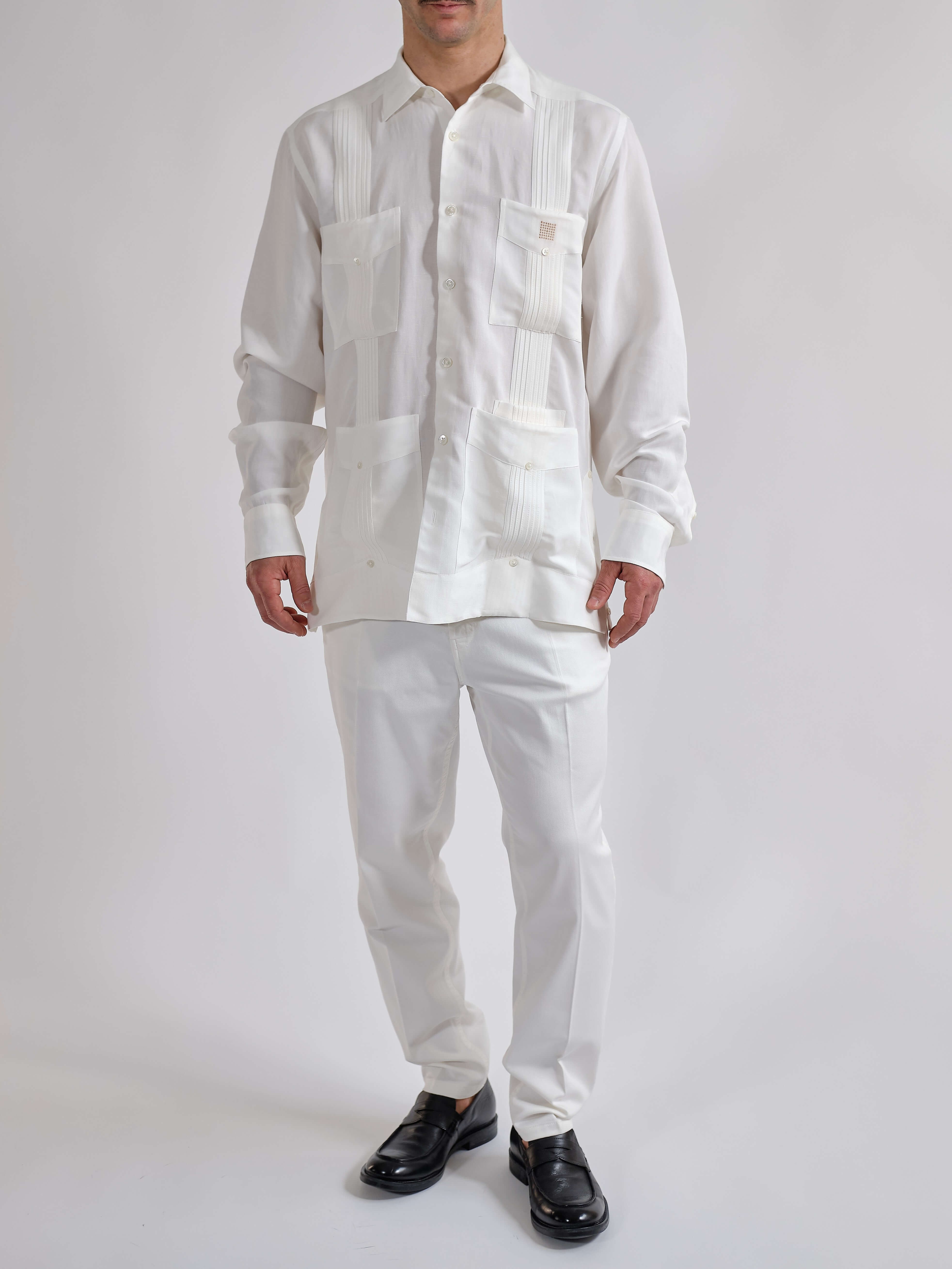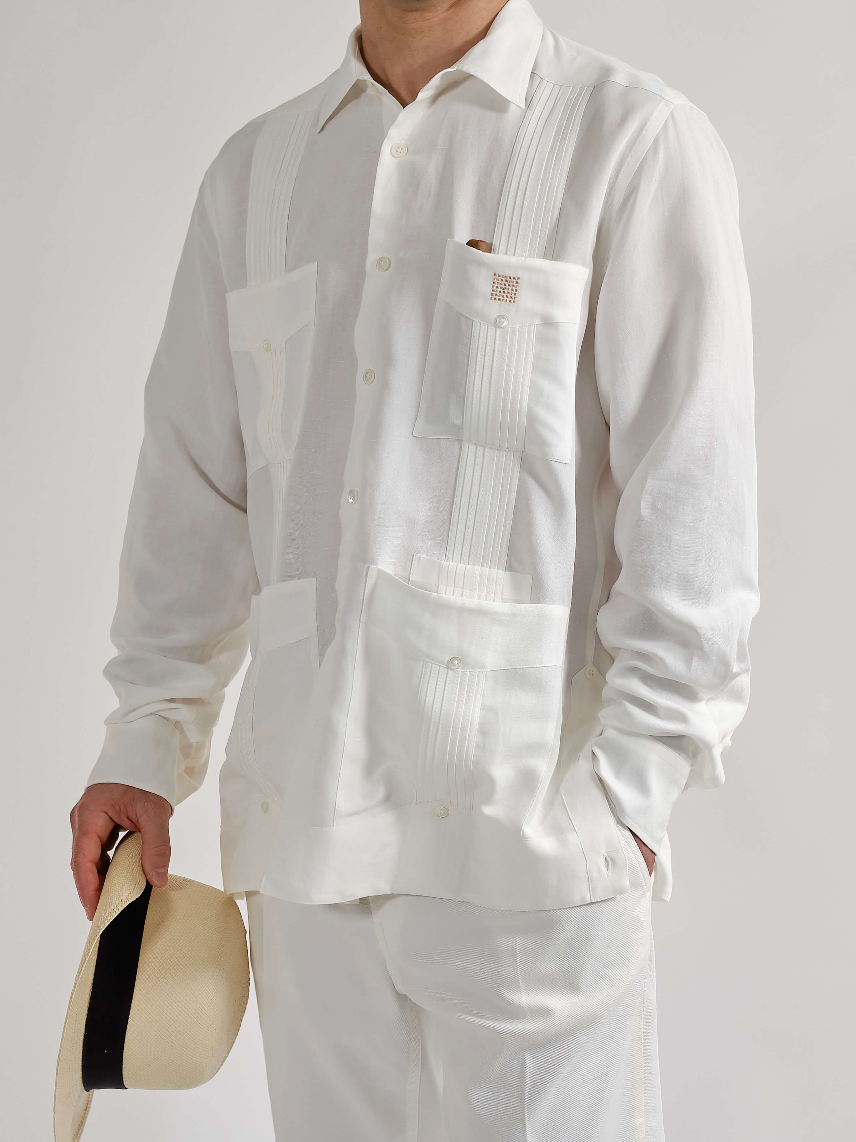 La Guayabera Members Only, il tessuto è un blend di due fibre naturali: Viscosa e Lino, una combinazione perfetta tra la texture del Lino e la fluidità della Viscosa. Si distingue per le sue tasche superiori quadrate, un dettaglio utile per mantenere al sicuro i tuoi Habanos, e una quinta tasca per l'accendino e il taglia-sigari, con bottoni in vera madreperla e il motivo ricamato in colore oro del logo Cohiba Atmosphere. Colori: bianco e nero. Vestibilità regolare